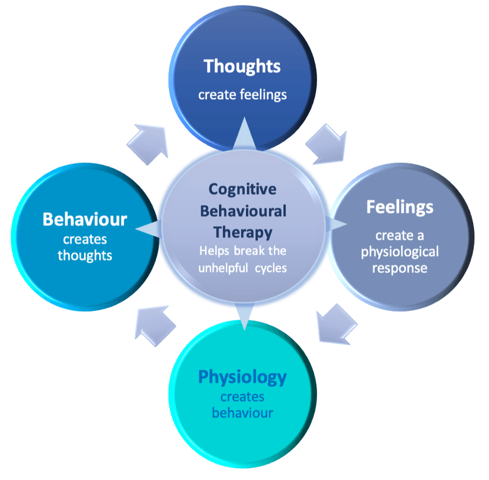 Cognitive Behavioural Therapy is a short term and time limited psychological therapy. It is a structured, interactive and goal-based therapy exploring and identifying how our thoughts, feelings, physiology and behaviours are related and how unhelpful patterns and habits can be formed.